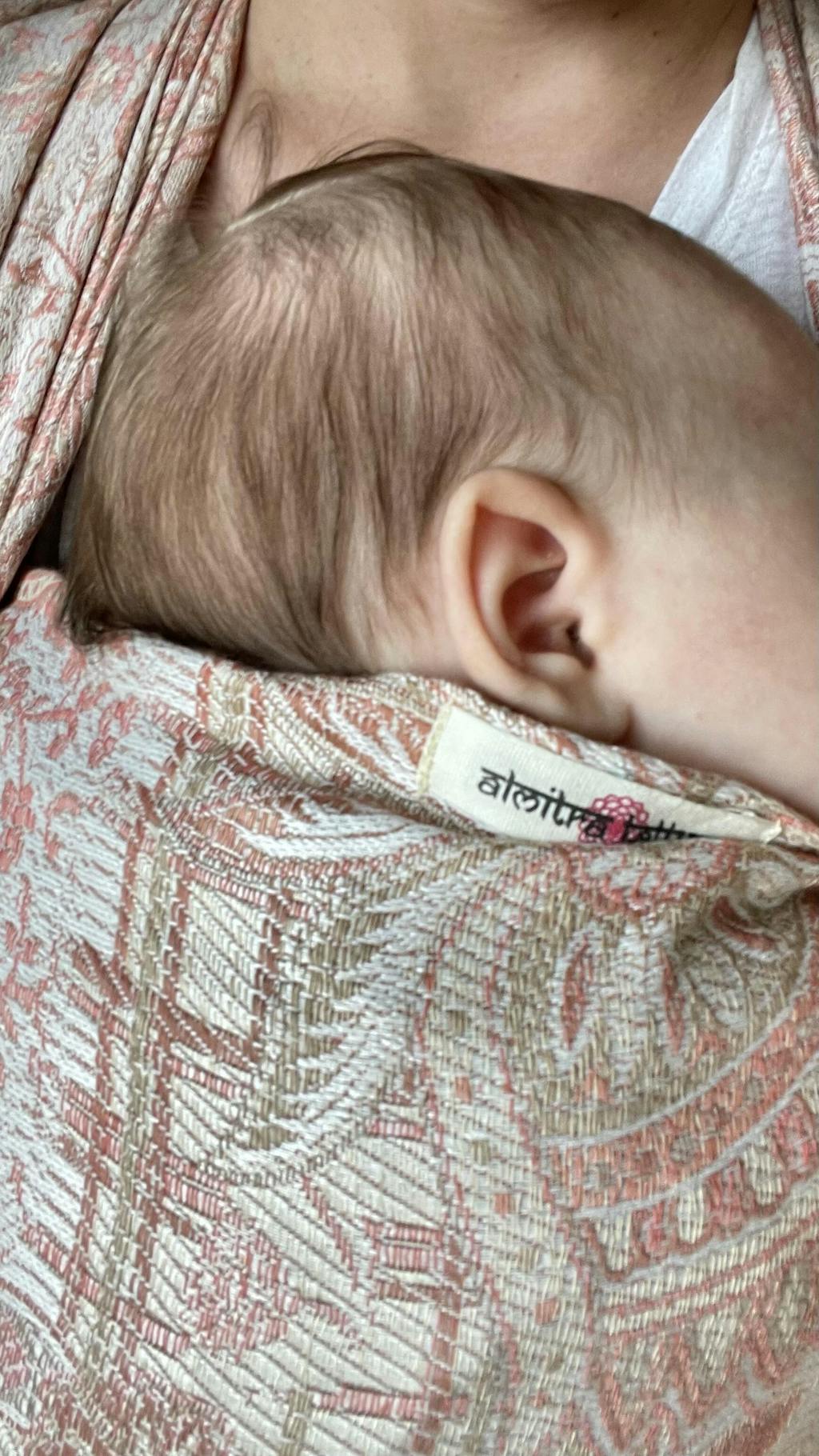 This wrap is pure perfection, still with my 2 year old! So floppy, airy, cushy pillow on my picky shoulders. Beautiful, love the subtle color of Tushara. Wish you could also weave longer sizes in the future as well, sz 7-8 would be great for fancier finishes <3